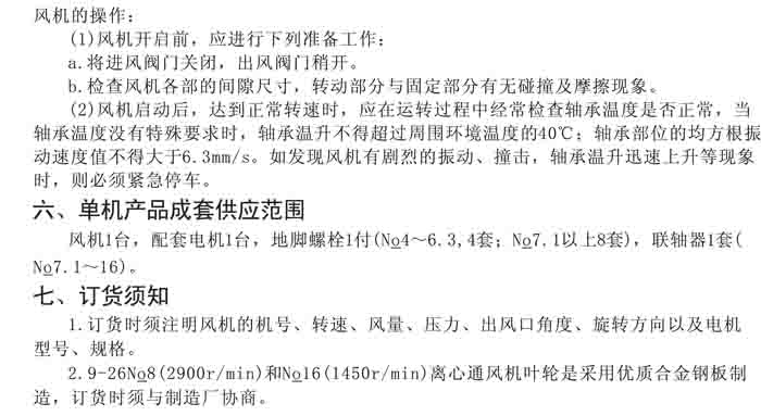 一、風(fēng)機(jī)選用參考、安裝維護(hù)使用說(shuō)明、常見(jiàn)故障分析、訂貨注意事項(xiàng)
